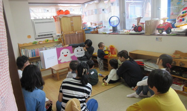 10月 おはなし会 2018年10月24日 koenhiroba 地域の人たちと 0 図書館等で読み聞かせボランティアをされている地域の方に来ていただきました。 大型絵本の迫力にびっくりしている様子でした。ボランティアさんの声と絵本に合わせてお母さんに抱きかかえてもらったりとみんな嬉しそうでした。上記の本を読んでもらいました。 11月は21日に行います。