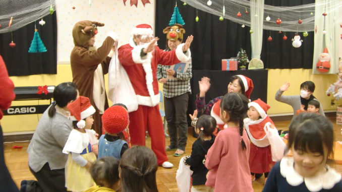 親子で一緒に「アヒルのダンス」、スタッフによる人形劇のあとは、お待ちかねのサンタクロースが鈴の音にのって登場!