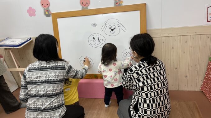 わんわんのえかき歌を紹介したあとは、親子でアンパンマンにチャレンジ。