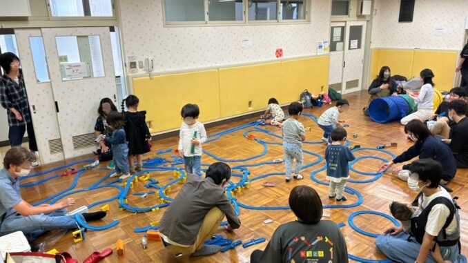 総持寺いのち愛夢センターの多目的室をお借りして、お部屋いっぱいに線路を繋げて巨大プラレールを作りました。