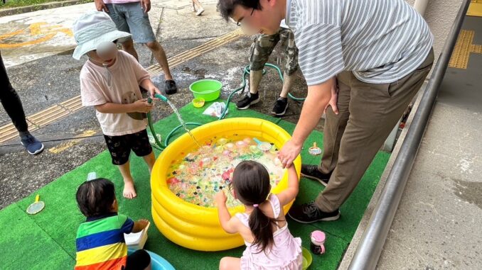 お天気が心配でしたが、良いお天気になり時間前から待ちきれない子どもたちとパパで水遊び始めました。金魚すくいや水風船、水鉄砲とびちょびちょになりながら親子で楽しみました。