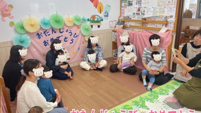 11月15日(金)、11月生まれのお友だちのおたんじょうび会をしました。12組とたくさんの方が参加してくれました。1丁目のドラネコのエプロンシアターや手遊び、みんなでしたり、ハッピーバースデー?の歌をみんなで歌ってお祝いしました。